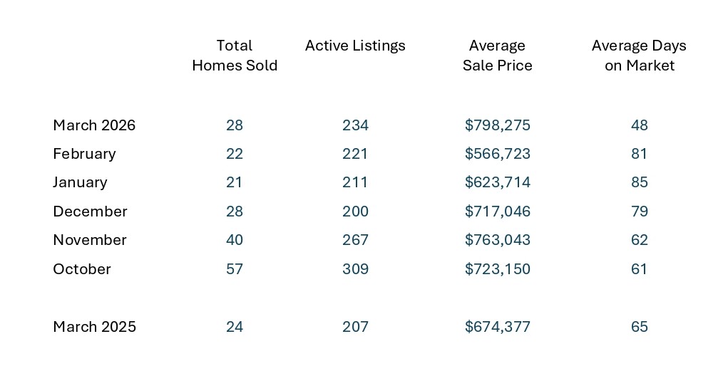 We saw 28 sales in March, up from 22 in February and also higher than the 24 sales in March of last year. Active listings sat at 234 at month end, compared to 221 the month before. Even with that increase, the pace of new listings feels a bit slower right now. A big part of that is likely the move-up market hesitating, and that group usually drives a lot of our inventory. If you’ve been thinking about making a move, it could be a good time to have a conversation and look at your options.